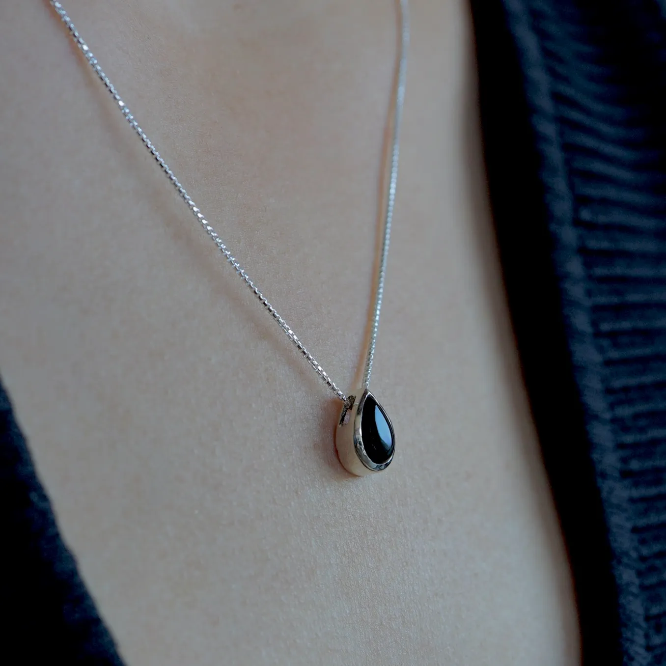 Minimalistisch, krachtig en stijlvol – dat is de black onyx ketting Belina. Deze verfijnde Venetiaanse ketting van 925 sterling zilver draagt een handgemaakte druppelvormige hanger met black onyx: een steen die je helpt gronden, focussen en innerlijke rust vinden.