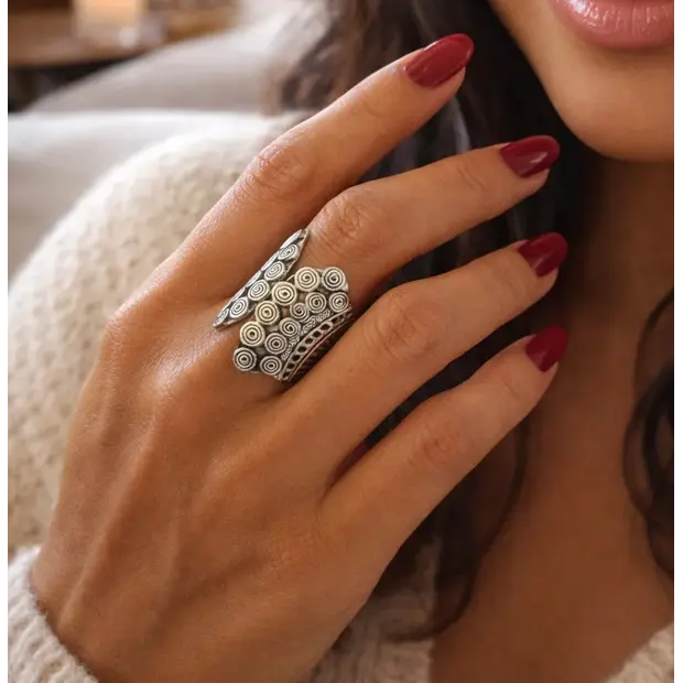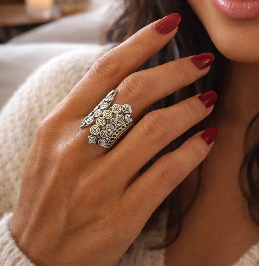 Boho ring Juanita is geen doorsnee ring – het is een expressief sieraad voor vrouwen die hun stijl durven te laten zien. Het brede, handgevormde design van 925 sterling zilver geeft deze ring een krachtige, bijna sculpturale uitstraling. Toch voelt ze licht en comfortabel aan dankzij de open structuur.