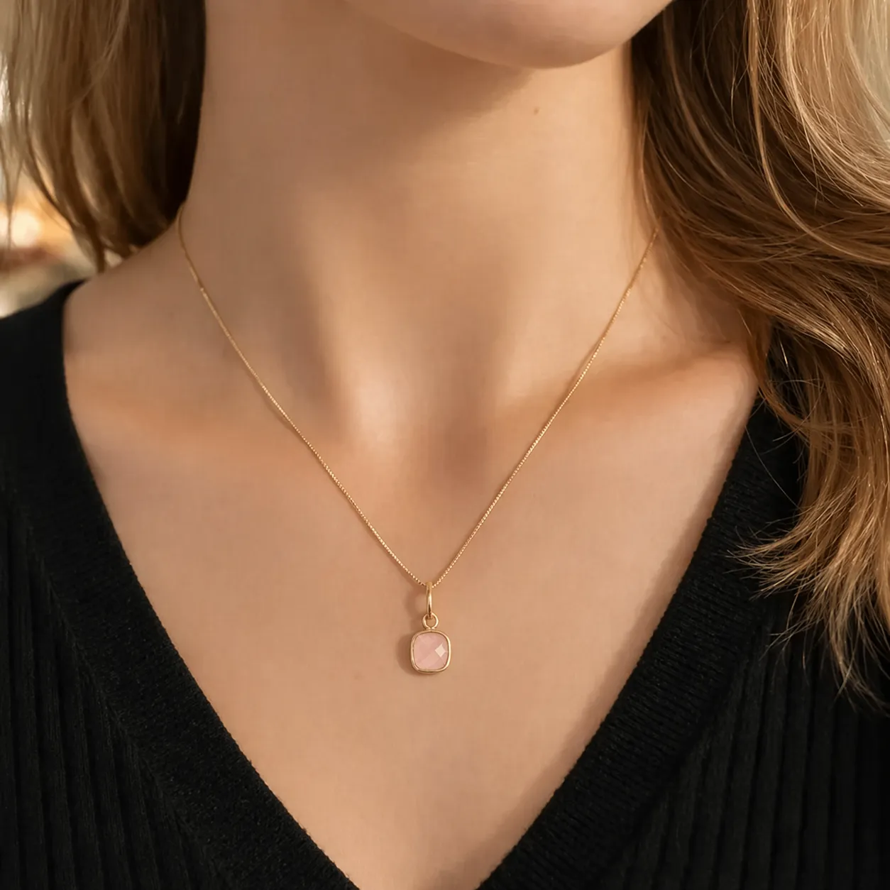 De roze chalcedoon hanger Caia Gold is een handgemaakte hanger van gold plated 925 sterling zilver met een vierkante facet geslepen roze chalcedoon van 0,8 cm in een strakke bezel zetting. De cushion cut slijping — een vierkante vorm met afgeronde hoeken en facetten — geeft de steen een subtiele glinstering die de warme roze kleur van chalcedoon mooi laat uitkomen. De gouden kleur van de zetting versterkt de warme, zachte tint van de steen.