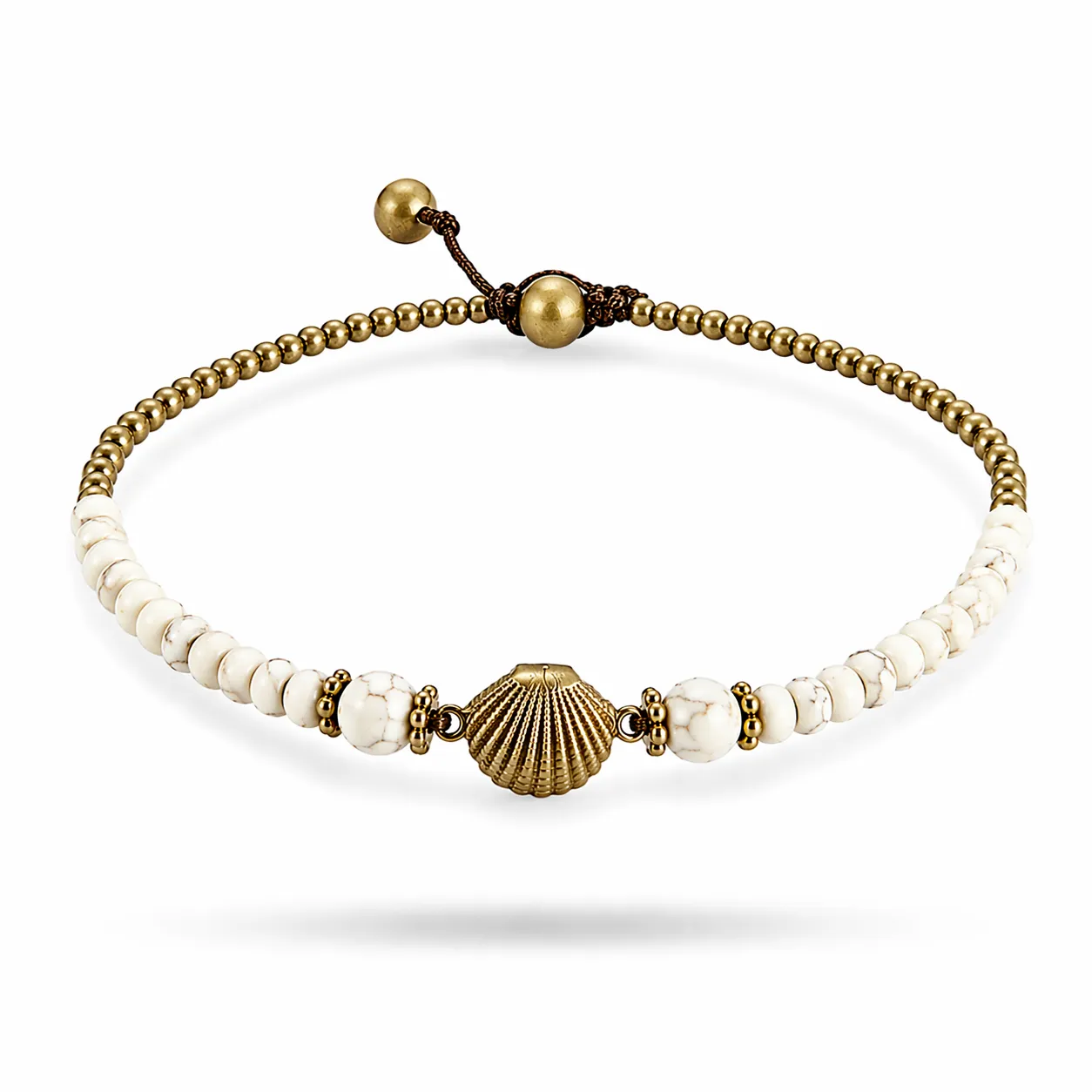 Enkelbandje met off-white artificial howliet en goudkleurige brass kraaltjes en een shell schelpje.