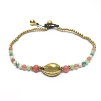 Hoe leuk is dit enkelbandje met een goudkleurige cowrie schelp! De mooie pastelkleurtjes maken dit bandje tot een echte summer musthave.