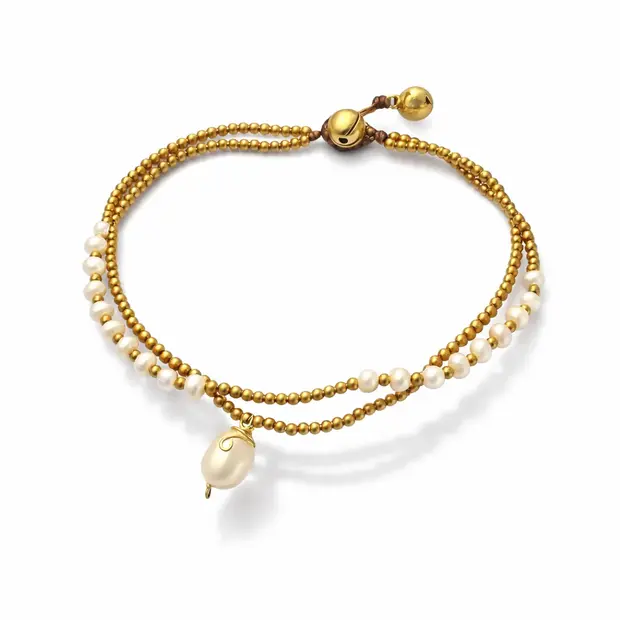 Dit parel enkelbandje is een ware ode aan de zoetwaterparel. De combinatie van kleine pareltjes langs de hele streng, goudkleurige brass kraaltjes en één grote zoetwaterparel als stralend middelpunt maakt dit bandje niet alleen opvallend, maar ook verfijnd elegant. Mooi onder een zomerjurk én hip onder je spijkerbroek.