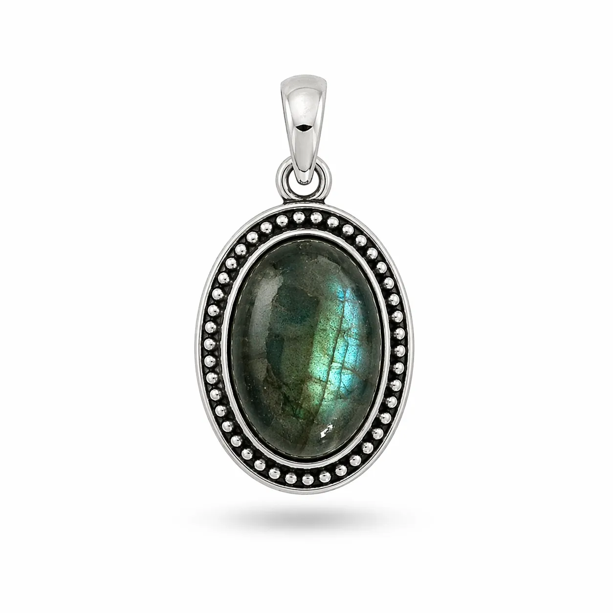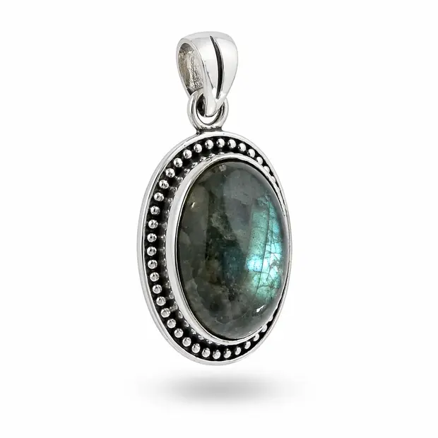 Labradoriet hanger Maria — zilveren hanger met bewerkte rand en ovale labradoriet
