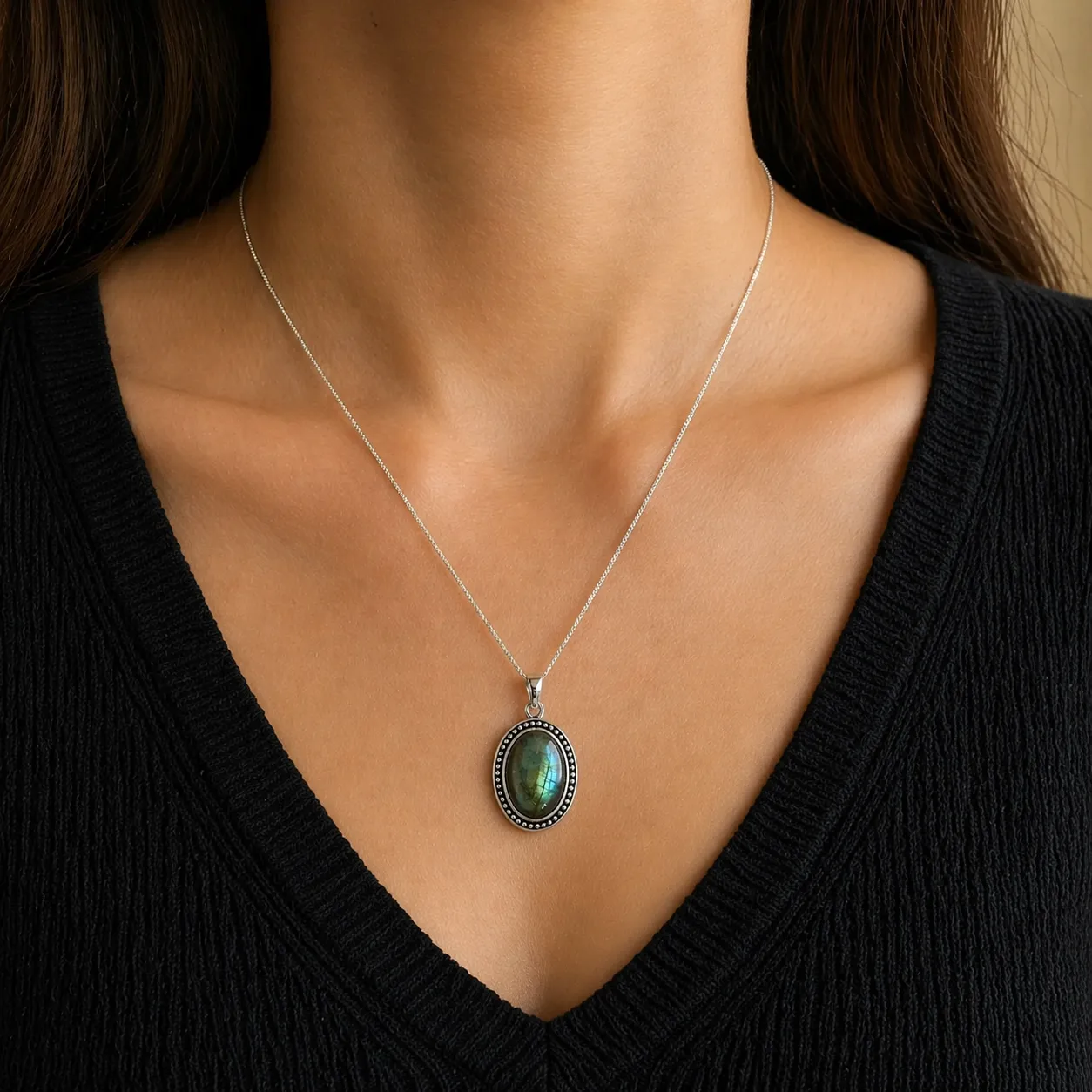De labradoriet hanger Maria is een handgemaakte zilveren hanger van 925 sterling zilver met een ovale cabochon labradoriet. De rand van de zilveren kast is met de hand bewerkt — een detail dat de hanger een warme, ambachtelijke uitstraling geeft die goed past bij een boho of spirituele stijl. Labradoriet staat bekend om zijn kleurenspel: afhankelijk van de lichtinval wisselt de steen van diepblauw naar groen en goud. Elke steen is uniek.