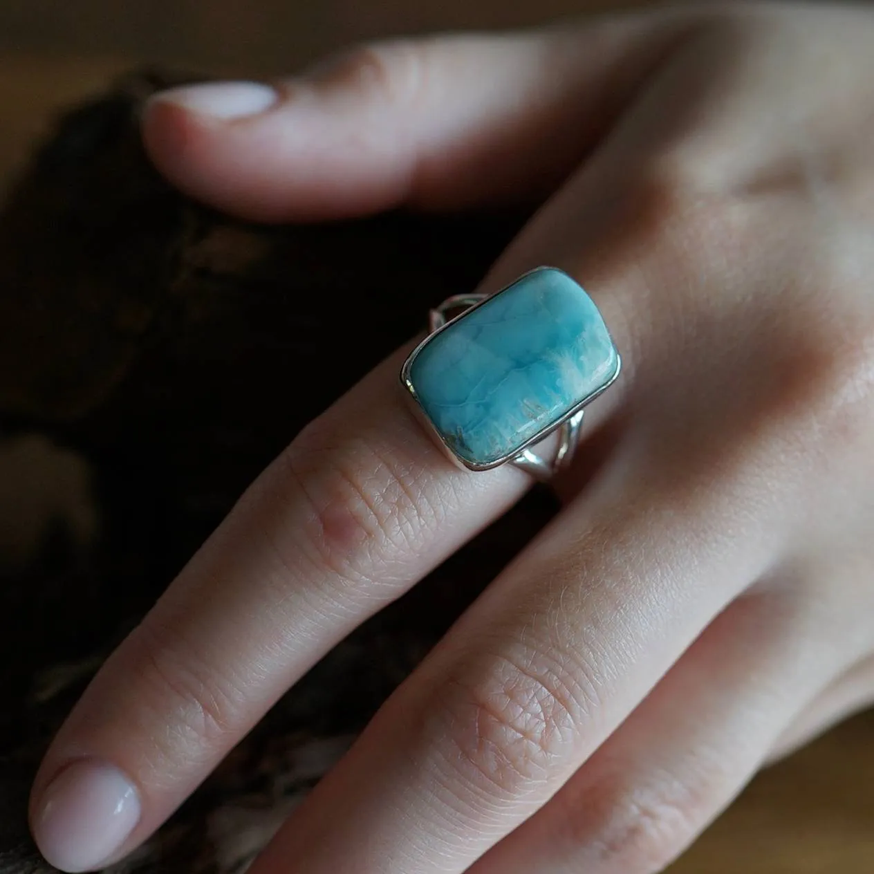 Zacht, vrouwelijk en vol symboliek – dat is de Larimar ring Preciosa. Deze elegante ring is met de hand gemaakt van fairtrade 925 sterling zilver en bevat een zorgvuldig geslepen Larimar edelsteen in druppelvorm. De lichte, blauwe tinten van de steen doen denken aan helder water en rustgevende luchten.