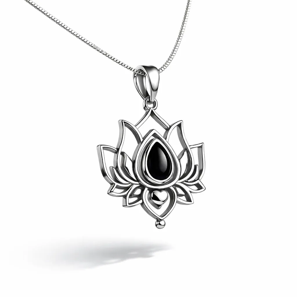 Deze zilveren lotus hanger met druppelvormige black onyx is niet zomaar een sieraad – het is een krachtig symbool van innerlijke groei en bescherming. De lotusbloem staat voor transformatie en zuiverheid, terwijl black onyx bekendstaat om zijn aardende en beschermende eigenschappen.