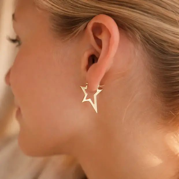 Het ontwerp is luchtig, licht en toch krachtig. De strakke stervorm geeft een speels accent aan je outfit, terwijl de warme goudkleur moeiteloos combineert met zowel minimalistische als expressieve stijlen. Perfect voor een feestje, een etentje of gewoon… omdat je er zin in hebt.