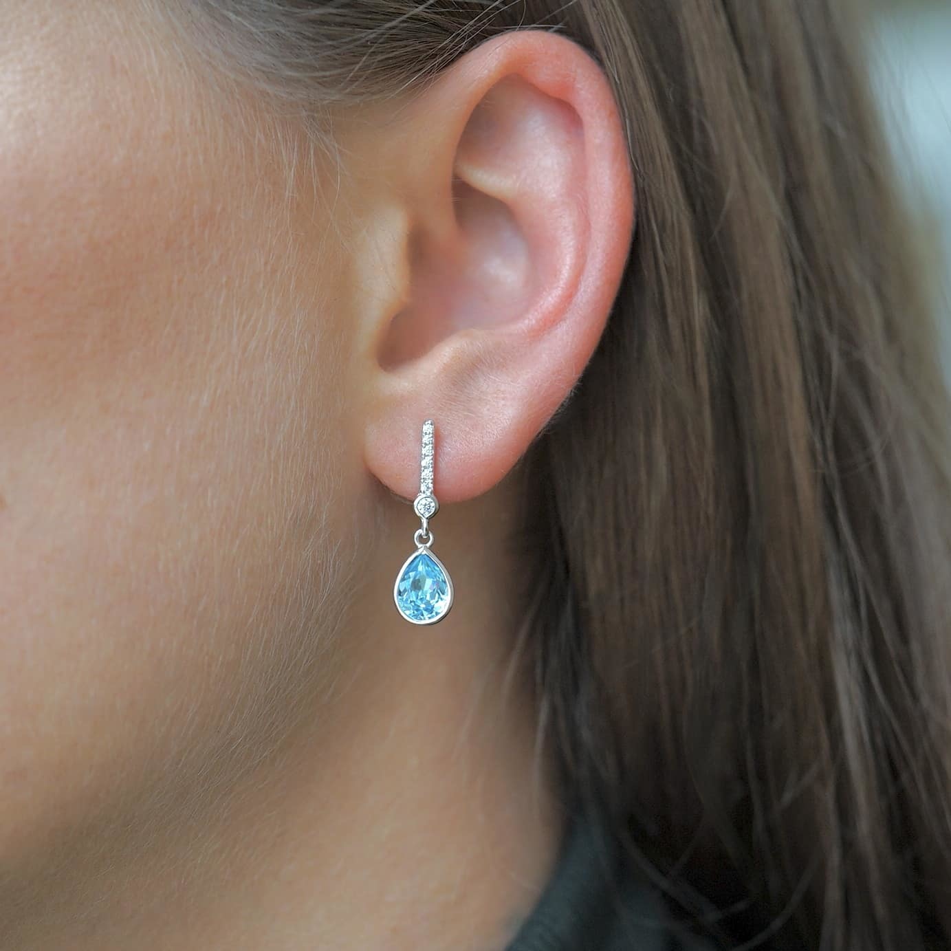 Super fijne oorknopjes met gesimuleerde diamant en crystal. De druppelvormige hanger is prachtig sky blauw van kleur. Shine bright like a diamond!