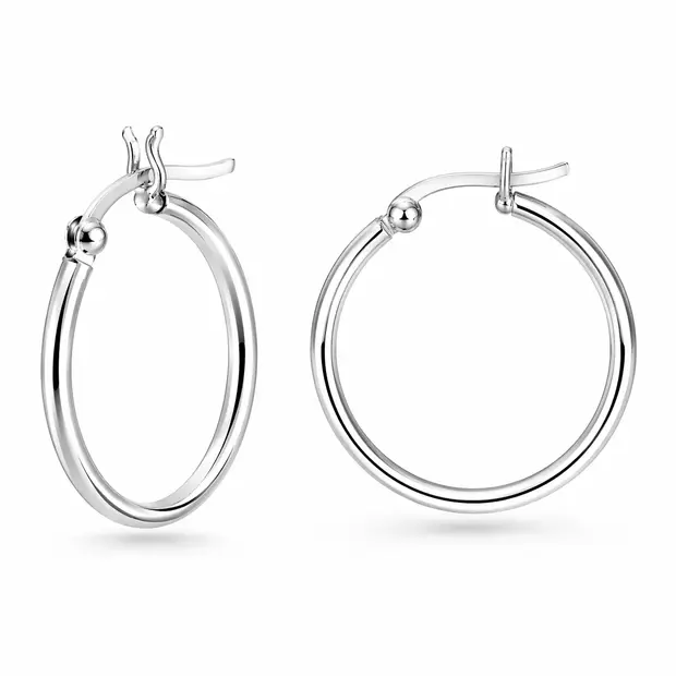 Deze zilveren oorringen van 925 sterling zilver hebben een diameter van 25 mm en zijn voorzien van een Franse sluiting. Door de grotere diameter vallen deze hoops meer op dan de kleinere 14 mm variant — ze geven een open, luchtige uitstraling die goed combineert met zowel casual als geklede looks. De Franse sluiting zorgt voor een strak, gesloten uiterlijk: de sluiting is aan de voorkant niet zichtbaar.
