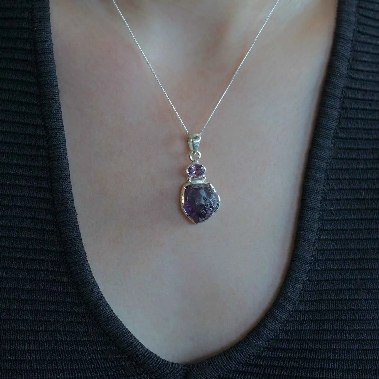 Hanger Hesther is een opvallende combinatie van puur natuur en verfijnde elegantie. Deze unieke hanger bestaat uit een ruwe amethist steen én een ovaal, facet geslepen amethist steentje – samen gezet in een stijlvolle kast van 925 zilver. Een bijzondere balans tussen stoer en chic.