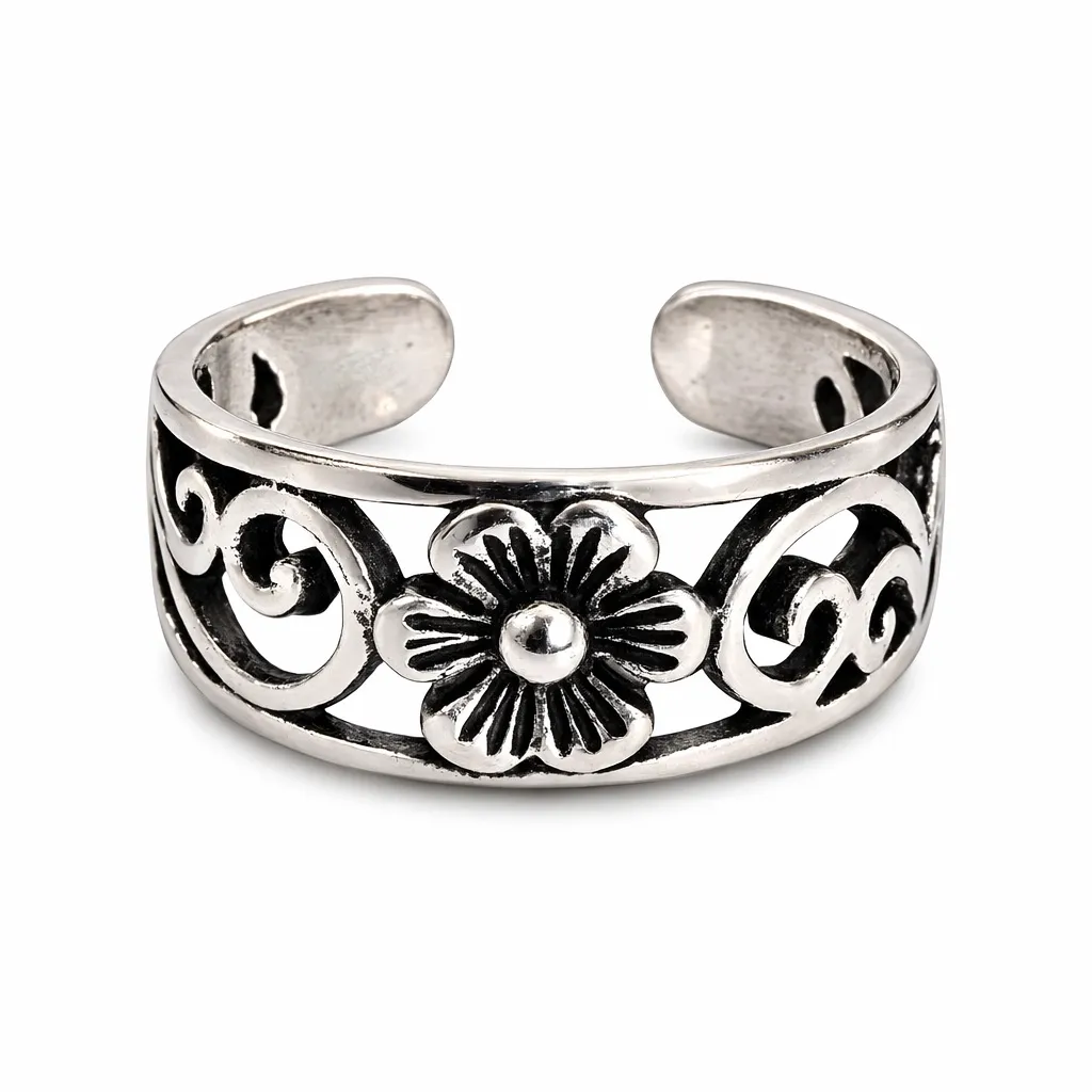 Deze teenring is prachtig bewerkt en heeft een lief bloemetje op de voorkant. Gemaakt van echt zilver, dus je kunt hem gewoon omhouden als je gaat zwemmen.