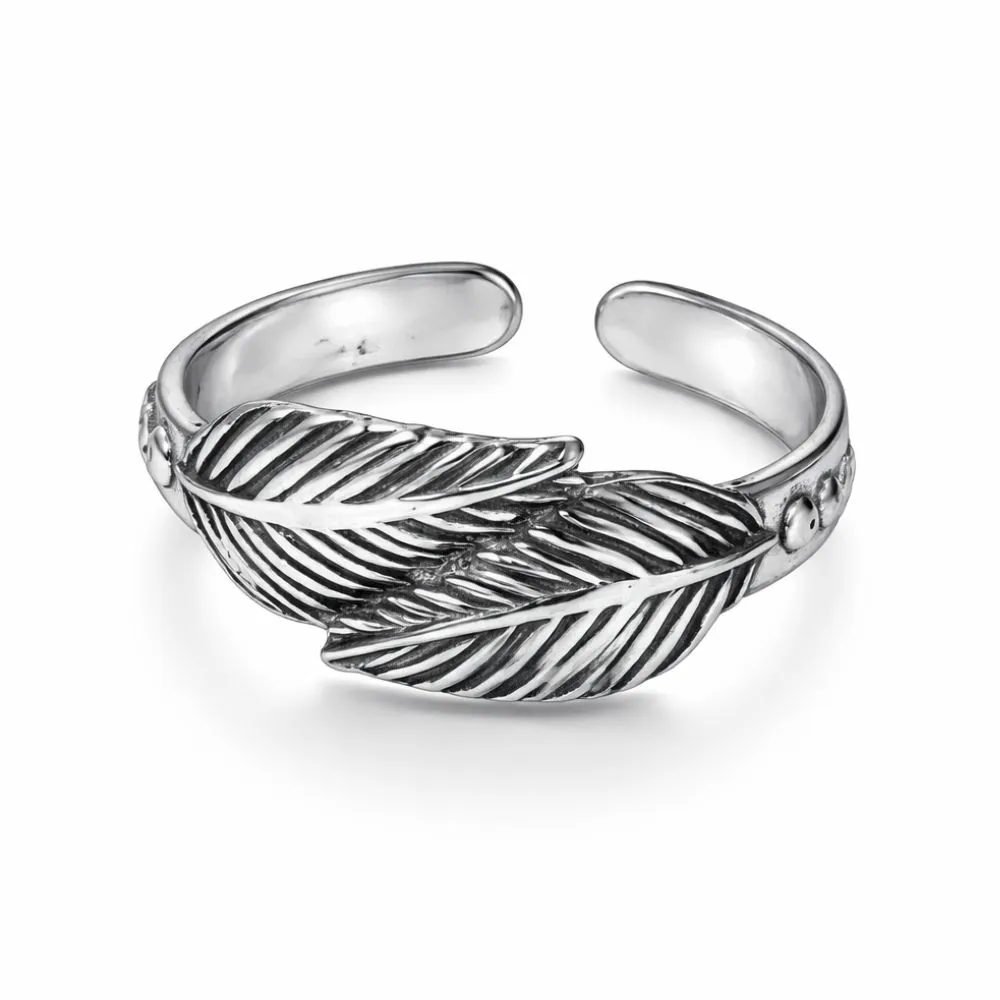 Fraai ringetje met 2 geoxideerde zilveren blaadjes, de zijkant van het ringetje is gemaakt van glanzend zilver.