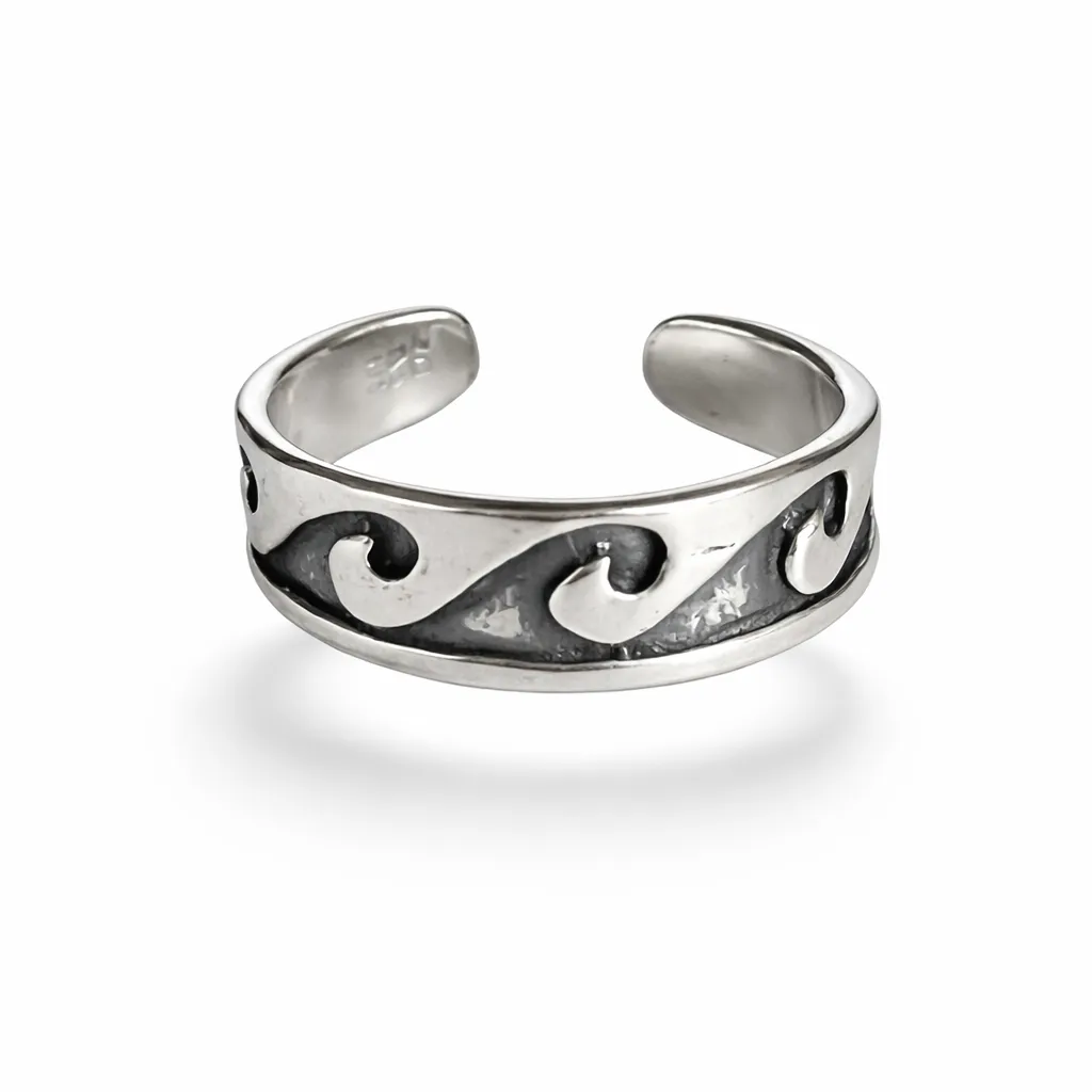 Mooie robuuste zilveren teenring met wave motief, voor de oceaan en surf dudes en babes! Gemaakt van echt zilver, dus je kunt hem gewoon omhouden als je gaat zwemmen.