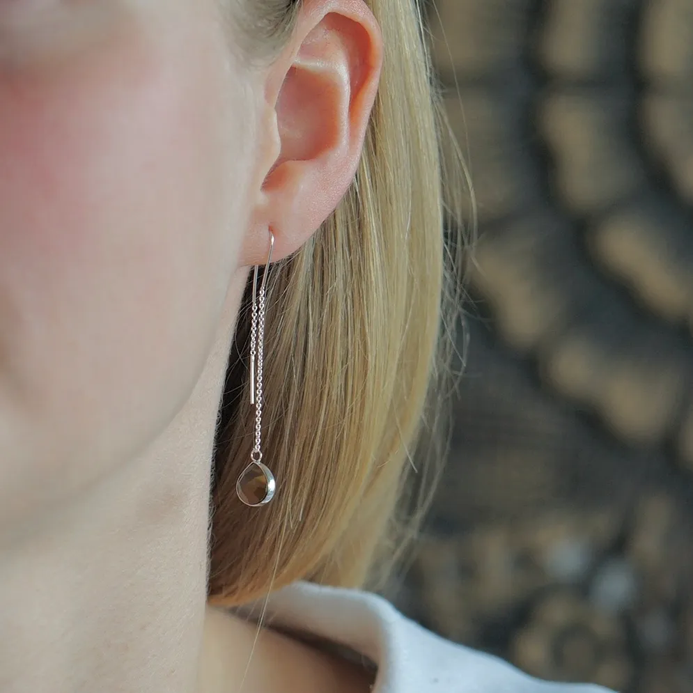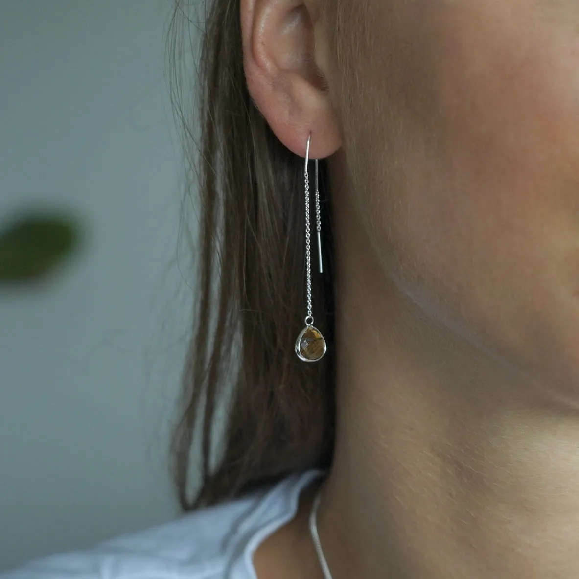 Deze zilveren doortrekoorbellen met facetgeslepen tijgeroog zijn gemaakt voor vrouwen die krachtig in het leven willen staan, zonder concessies te doen aan stijl. De druppelvormige edelsteentjes vangen het licht op een schitterende manier en geven elke beweging iets mystieks.