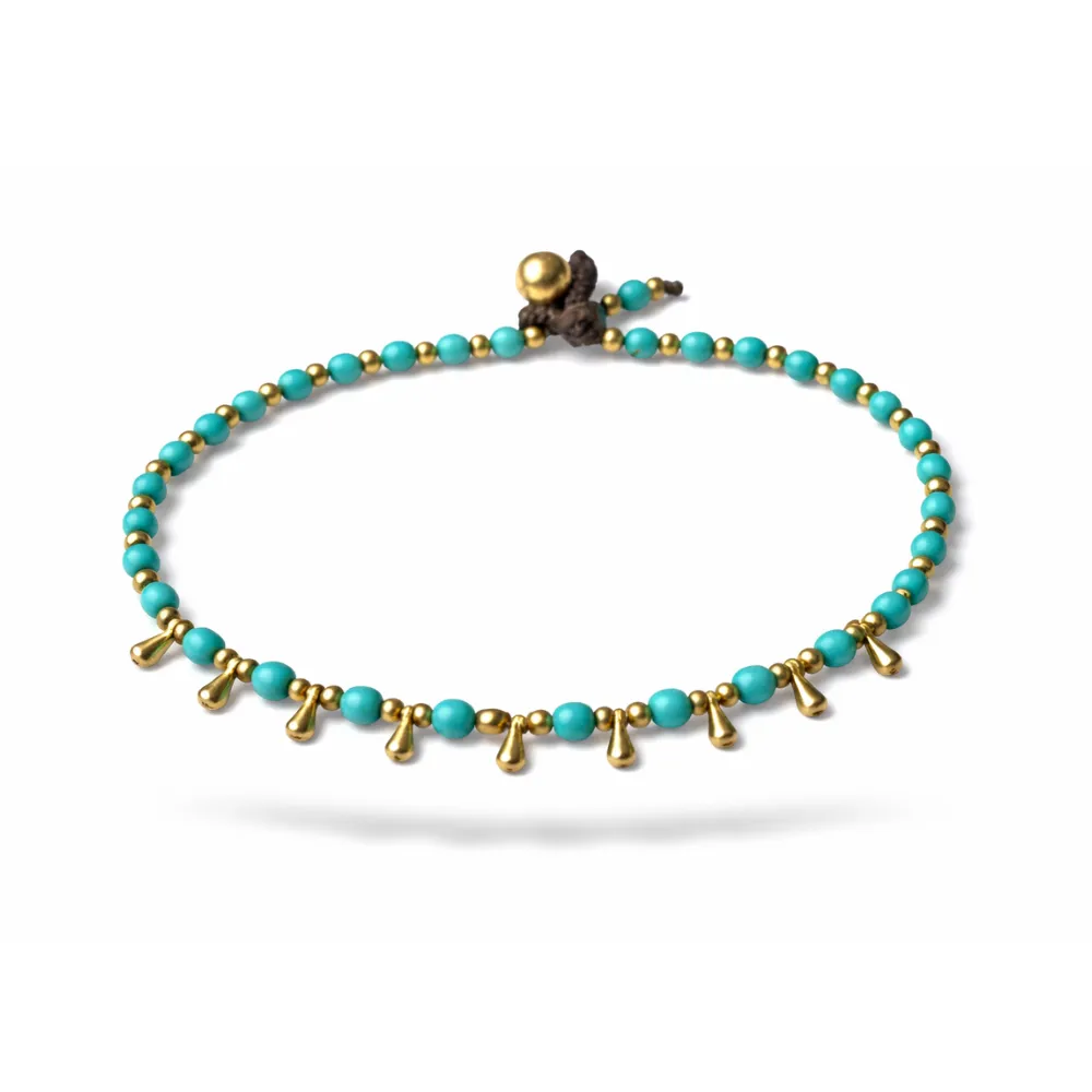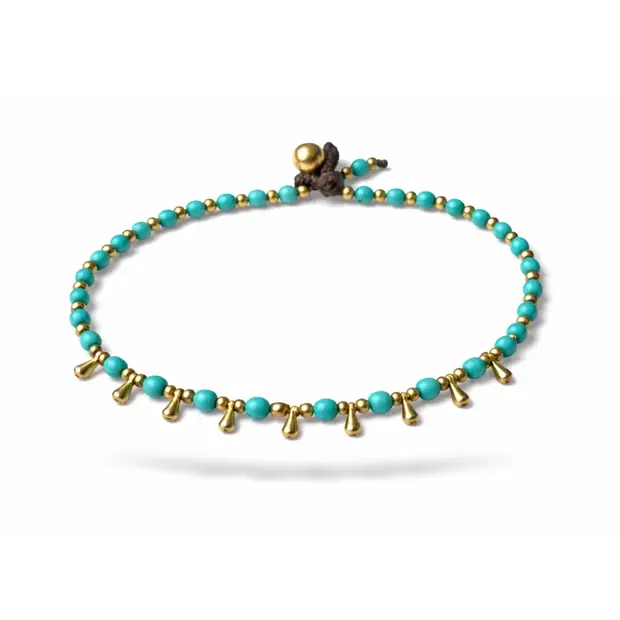 Turquoise enkelbandjes geven je het ultieme zomergevoel. Dit enkelbandje heeft kleine goudkleurige druppelvormige kraaltjes in het midden.
