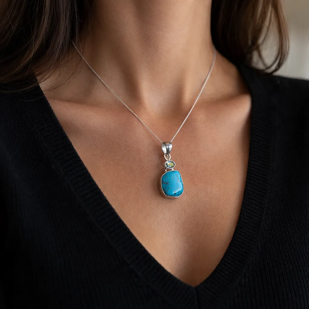 Deze bijzondere turquoise hanger met aquamarijn is een echte blikvanger voor wie houdt van natuurlijke vormen en betekenisvolle sieraden. De combinatie van een ruwe turquoise in vrije vorm en een facetgeslepen aquamarijn in ovale vorm geeft deze hanger een speelse en tegelijk elegante uitstraling.