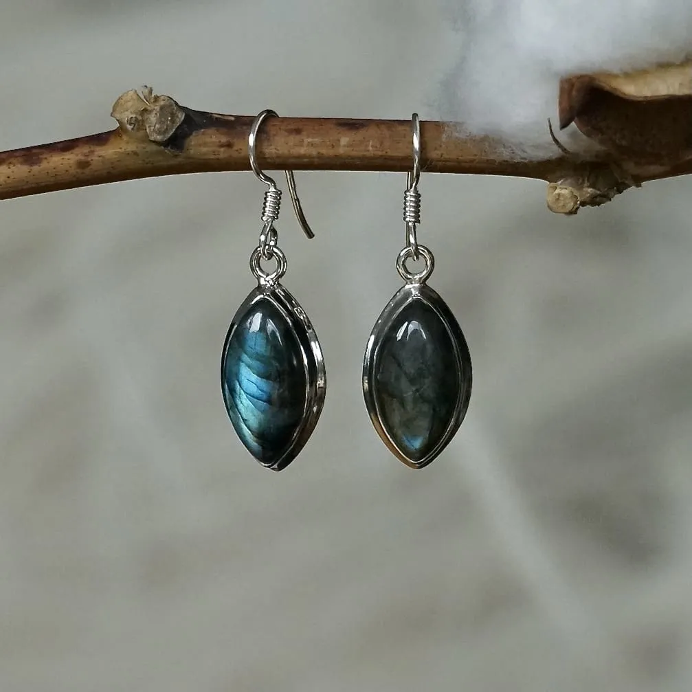 Zilveren oorbellen met labradoriet – Langwerpige edelsteen oorbellen